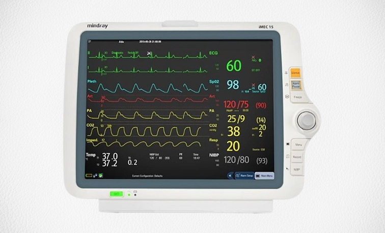Monitor multiparamétrico para acompanhamento contínuo de sinais vitais.