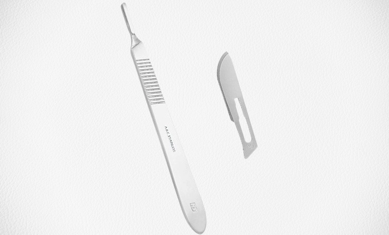 Bisturis descartáveis e lâminas para incisões cirúrgicas controladas.