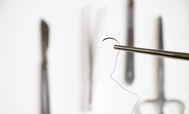 Tesouras e Pinças cirúrgicos para procedimentos com precisão.